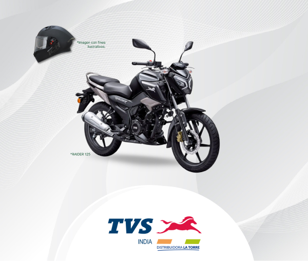 Aprovecha el precio especial de la Motocicleta TVS Raider 125 a solo Q14,990 en TVS, al pagar con tu Tarjeta de Débito o Crédito Banrural.